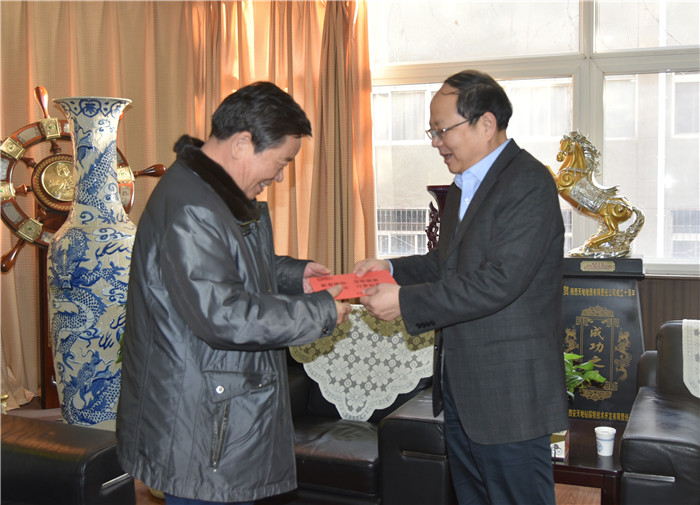 陕投集团总经理宋老虎向集团劳动模范王永森送上慰问金