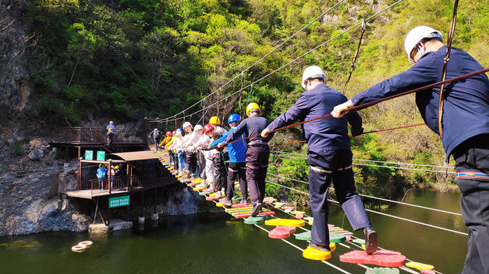 下午,天空依然晴朗,员工们来到紧邻牛背梁的终南山寨开展团建活动。首先映入眼帘的终南山寨大门与大自然浑然一体,给人一种古朴神秘的感觉。走过仿古老街,绕过运动乐园、阳坡院子等连成的休闲游览区,在拓展训练营体验了步步惊心、勇攀高峰、滑索飞人等十余个项目。大家互相鼓励加油,增强信心,凝聚力量,超常发挥,大多数员工基本都是打了通关,也有没把握好平衡而无险落水的,给活动增添了乐趣。通过这次团建活动也使员工切身体会到团队的氛围可以激发个人潜力,如果没有团队力量的传递个人很难达到最佳状态,增强了集体观念,提升了团队精神。